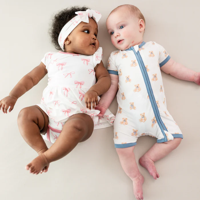 A twirl skirt and ruffled sleeves add the sweetest touch to this classic bodysuit. Adorable, functional, and comfortable, this all-in-one outfit keeps diapers out of sight for a neat and stylish look. Super soft Rayon made from Bamboo stretches to grow with your little one, so you can use this piece time and time again for any occasion.